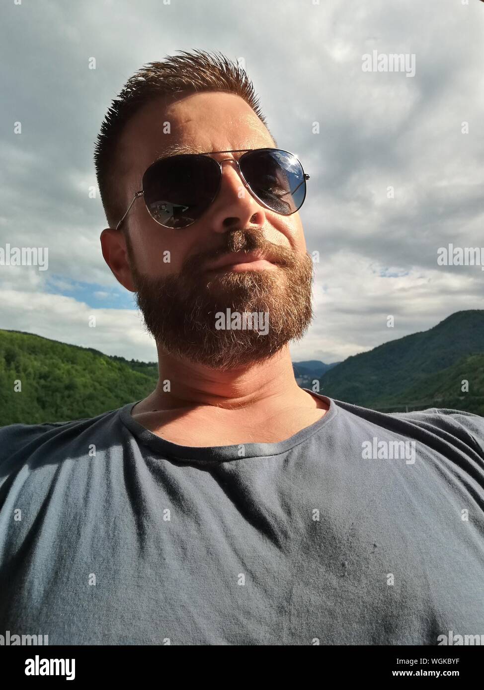 Happy man wearing sunglasses portrait of smiling man wearing sunglasses and looking away in the city streets.